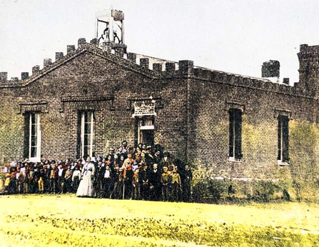 "The building was built in the Fall of 1855. On the corner of Oak and Jefferson Streets; present site of the County Jail. V. P Baker was the contractor and builder. The building was built of bricks, cost of $3000.00 and was the first public school building erected in the County. Mr. J.D. George was employed  as teacher. The bell was purchased at that time and which was still in use in the new public school. Building was purchased in San Francisco and freighted up free by Capt. J.S. Johnson, Steamboat agent. A part of the subscription money for its purchase could never be collected. The amount  of $60.00 was advanced by Butler and Webb upon a promise of repayment, but it never was. During the school year of 1872, the old public school building in Red Bluff was sold to the county for $600 and a new two-story brick building was erected on Oak Street, at a cost of about $17,000.00 with furniture.